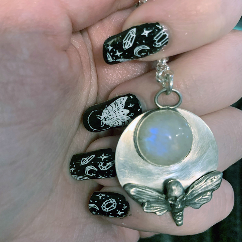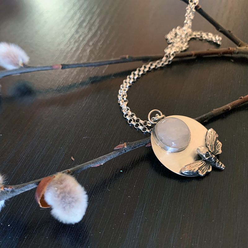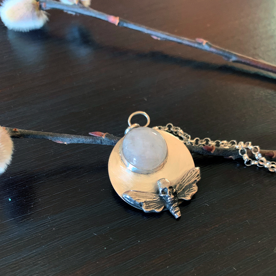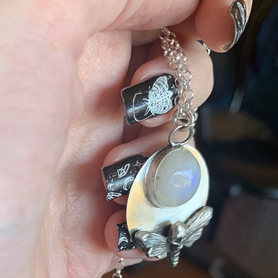 I wanted to create the crescent shape of the moon (as the base) as well as represent the full moon with the moonstone. There is a silver casting of a death’s-head hawkmoth below the moonstone, which has a beautiful blue flash at certain angles. Death’s-head hawkmoths are nocturnal, so it needed to be paired with the moon. The pendant is about 1″ in diameter, and the chain is about 10″ long from the clasp to the top of the pendant.