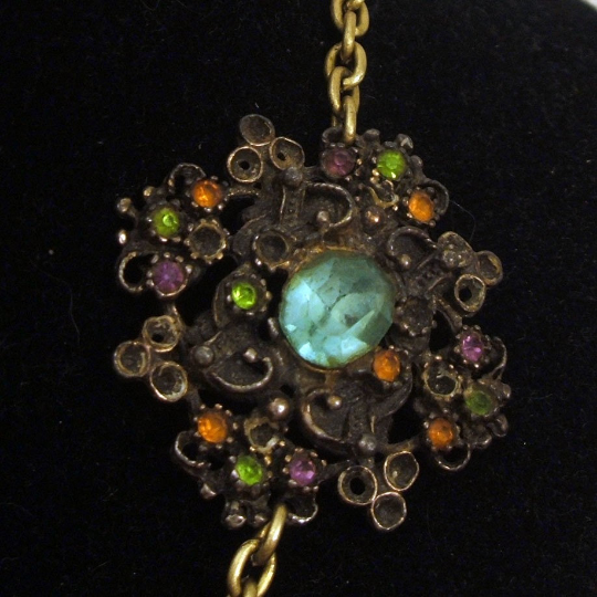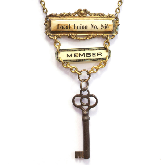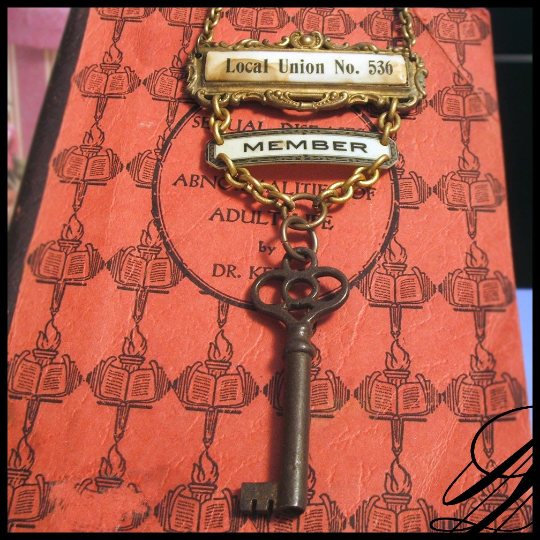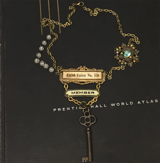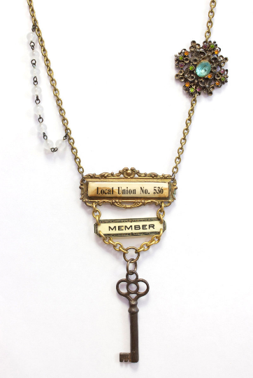 This statement necklace features an antique celluloid union badge, an antique key, beads/chain from an antique rosary, and an antique rhinestone component. The combined age of the pieces of the necklace is about 400 years old (crazy!). The pendant is about 5″ tall from the top of the badge to the bottom of the key. The necklace is about 22″ long from clasp to clasp.