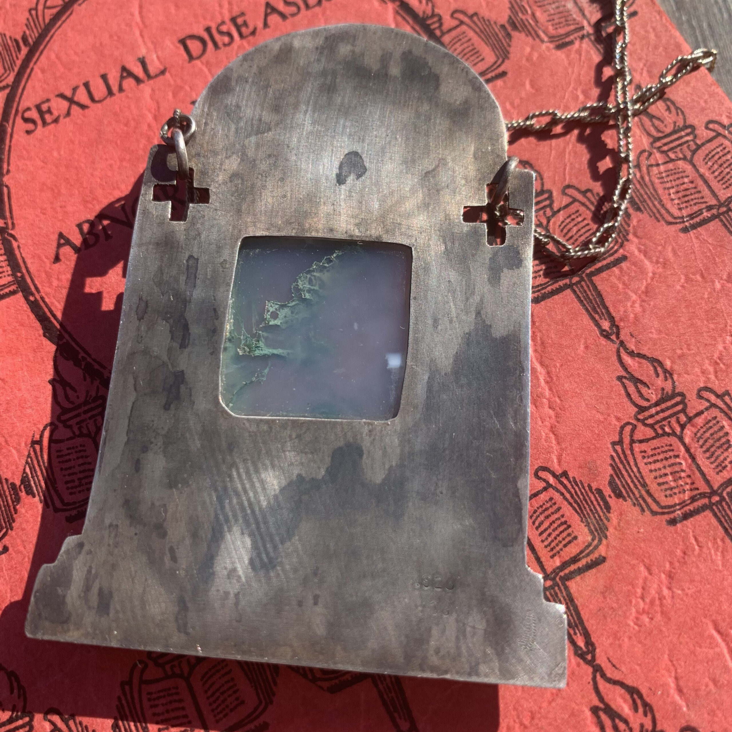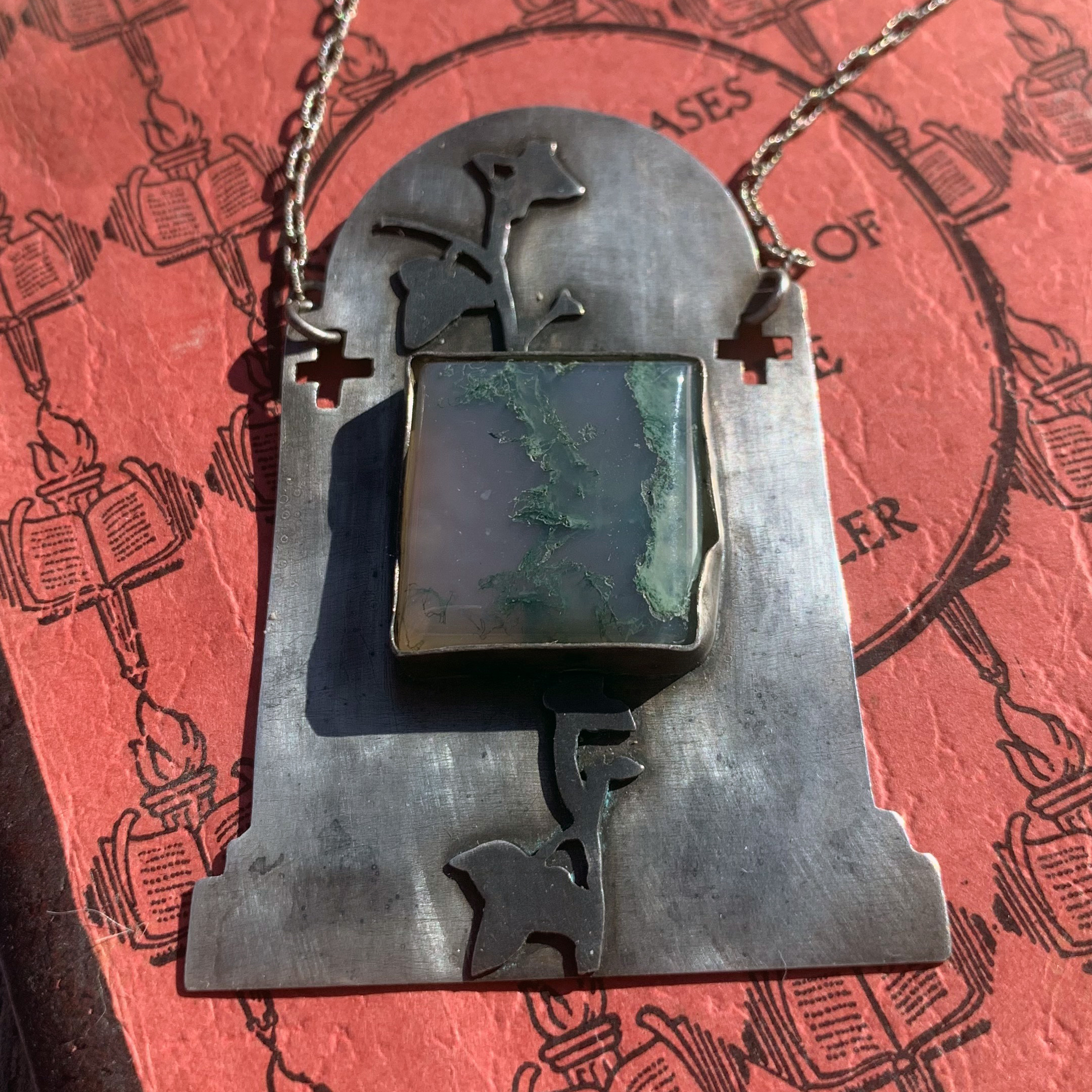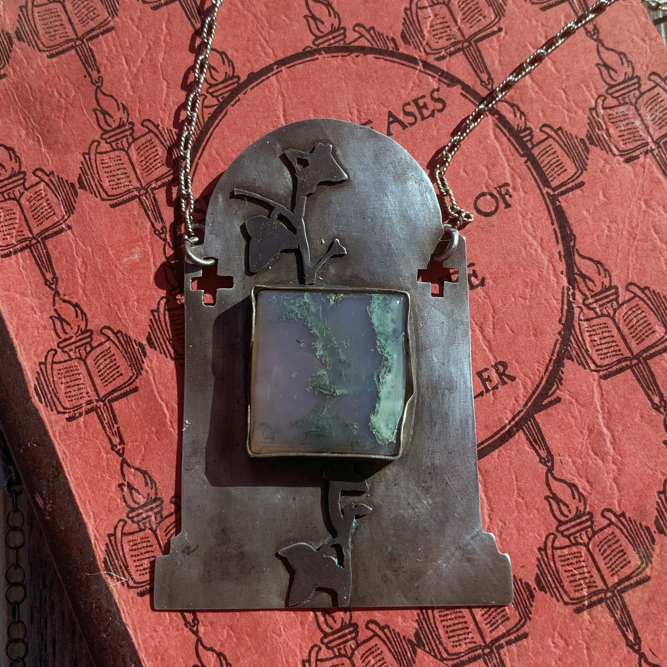 This sterling silver, tombstone-shaped necklace features a moss agate and hand-sawed ivy that follows the path of green in the moss agate. The oxidation pattern reminds me of an especially weather-worn granite. This tombstone and moss necklace is a biggin at about 2.75″ tall. The chain length is about 9.5″ from clasp to pendant, and it has a brushed-silver finish. The stone was clicking, so I used a tiny bit of glue and reduced the price.